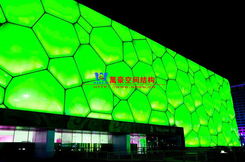 “水立方”就是一個(gè)非常典型的充氣式膜結(jié)構(gòu)建筑,它的外表由許多不同大小、形狀、矢高的ETFE氣枕組成,外層所使用的淺藍(lán)膜和內(nèi)層的鍍點(diǎn)膜在陽(yáng)光照射下讓ETFE氣枕出現(xiàn)兩個(gè)高光,更加體現(xiàn)出了水泡的特征。這種獨(dú)特的對(duì)光線控制的技術(shù),使得“水立方”成為了世界上獨(dú)特的建筑形式,展現(xiàn)出了前所未有的整體建筑的藝術(shù)效果。同時(shí)氣枕盡管大小不同,其矢高調(diào)剖控制在12-15%的跨度之內(nèi),這樣就是的整體效果此起彼伏,立體感更加的明顯,建筑的表現(xiàn)力更加的豐富。