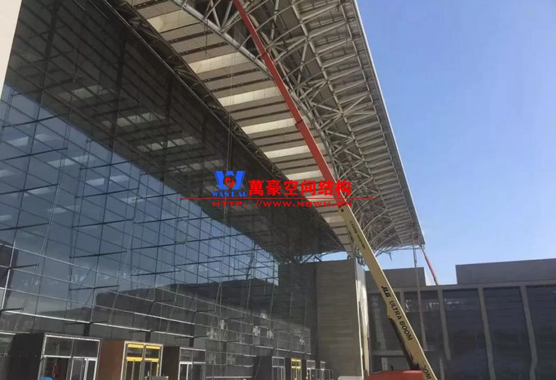 會展中心的入口大廳采用全透明幕墻,將南北向迥然不同的城市景觀聯系起來,輕質半透明屋頂覆蓋入口大廳的公共區域,輕盈的白色薄膜材質配以照明燈光,使整個大廳明亮而通透。該膜結構幕墻項目由寧波萬豪空間結構工程有限公司承建,項目完成的十分完美。