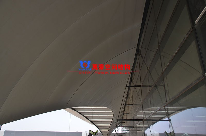 展廳的膜材透光率達到15%,東大廳和南北塔樓都采用的是魚腹式幕墻,這樣保證了透光效果更好,從外部看也更有設計感。