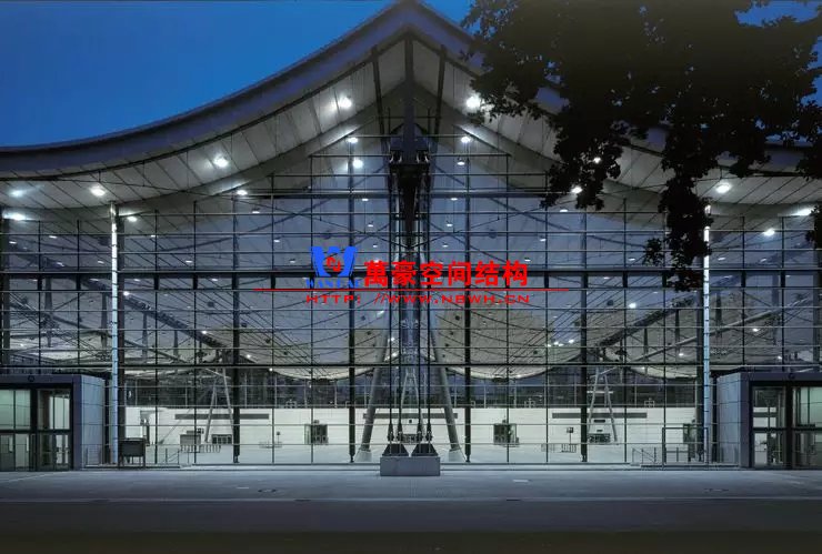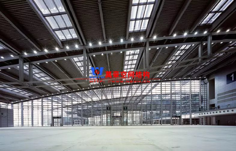 漢諾威會展中心是世界上最大、最負盛名的會展中心,超過50萬m2的凈展面積和每年超過50場的頂級展會,使其幾十年來穩居行業龍頭地位。1994年,在漢諾威會展中心4號展廳的競賽中,德國gmp國際建筑設計有限公司(以下簡稱gmp)和sbp結構工程師事務所(以下簡稱sbp)聯袂中標。展廳提供了一個通過玻璃采光頂自然采光的185.6m×116m的無柱大空間,凈展面積超過21 500㎡。雙層屋面結構的下層以承重金屬波形板將屋頂下的設備管道保護起來,同時利用雙層金屬板結構之間的空腔進行正壓送風,使得灰塵難以進入到空腔和管道。4號廳可以舉辦多種不同類型的活動,特別是容易產生灰塵的馬術等。