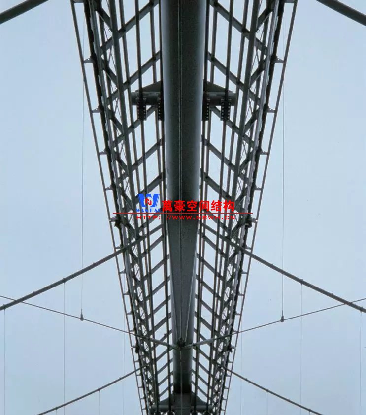 作為當時世界上最大的展廳,8/9號廳在設計和施工工藝上也幾乎達到了當時的技術極限。五榀138m長的類似自錨式懸索橋的主桁架是整個展廳的主脊,由主纜、背索、水平連接桿及吊索組成,并支承在兩端的A形柱上。主桁架之間設置了鋼板懸帶屋面,和傳統的懸帶屋面不同,為了避免加大主桁架的負擔,結構工程師沒有采用加重屋面板的傳統做法,而是在屋面下方加設穩定索,形成豎向剛度較高的索桁架來抵抗風荷載產生的上吸力和不均勻力。設計中充分利用懸掛體系,設置了包括兩個懸挑跨在內的六跨結構體系,在邊跨設置水平轉換桁架和斜拉索用于錨固。