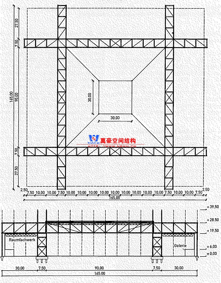 設計中采用了巨型結構內嵌子結構的模數化方式。平面布置為十字形的矩形桁架支承在四個桁架核心筒上,結合中間設置的巨型下張弦體系將屋蓋體系分成了若干個最大跨度為30m的區域,而30m的跨度正好是當時流行的網架結構的經濟跨度。結構工程師巧妙地結合了使用功能,與建筑師一起創造出了這個看似理所當然、實則內有乾坤的體系。