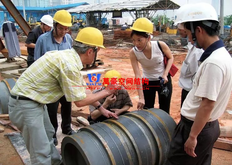 精心設計和建造的柱腳節點成為了整個項目的亮點。為了保證其轉動能力和側力傳力可靠,按設計要求,柱腳鉸支座的安裝精確到間隙不能超過15mm,這意味著跨度126m、高26m、重約500t的鋼箱梁連接在鉸支座上,兩邊間隙只能放進兩根頭發絲。這些經驗為后續其他項目的鋼結構加工和驗收提供了非常重要的技術支持。