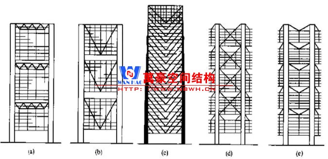 (1) 結(jié)構(gòu)的主要承重構(gòu)件為兩端的巨型格構(gòu)柱,承受全樓的重力荷載和水平荷載。每個巨型格構(gòu)柱的平面輪廓尺寸為4.8mx5.1m,由4個圓鋼柱組成,鋼柱間每隔3.9m(層高)均連以矩形截面加腋鋼梁,形成空腹格構(gòu)式的豎向構(gòu)件。水平面內(nèi),還增加了斜向的交叉撐。