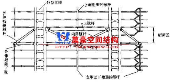 (3) 各樓層的重力荷載由5個不同高度上設(shè)置的“兩層高伸臂桁架”分別承受,5個部分相互獨立,從上至下分別懸掛著4層、5層、6層、7層和8層樓蓋。具體做法是在該桁架中部和兩端共懸吊3根吊桿,分別承受下部數(shù)層樓蓋的荷載,并將它們傳遞給巨型立柱。