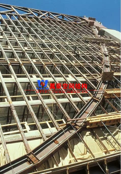 (3)全樓東西向的穩(wěn)定,由上述5個兩層高的桁架與格構(gòu)柱形成框架來保證。南北向的穩(wěn)定,則要靠設(shè)置在中間5排的兩層高的交叉撐提供;它們與兩層高的桁架在同一標高上。此外,還有交叉撐位于第5~8層間的大廳中庭處。