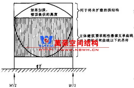該11層建筑頂部為一長條形矩形平面,目前沒有任何結(jié)構(gòu)。將來需要增層擴建時,可在它上面再架設(shè)承重拱結(jié)構(gòu)。新增樓層的重力通過拱傳遞給兩側(cè)筒體,并產(chǎn)生筒體向外的推力,正好可以平衡懸索引起的向內(nèi)的壓力。
