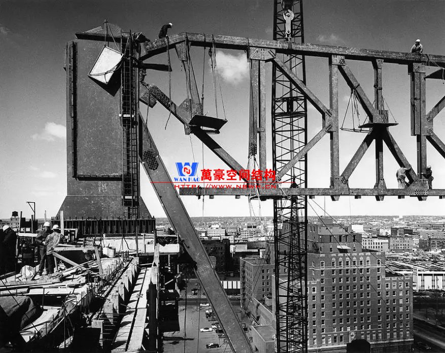 懸索上部支承著受壓鋼立柱(工字形截面),其下部以同樣的間距吊掛著受拉吊柱(扁鋼)。為方便連接,數(shù)根4英寸(100mm)直徑的懸索內(nèi)嵌在寬翼緣的構(gòu)件中,立柱和吊柱均與懸索外面的構(gòu)件相連。