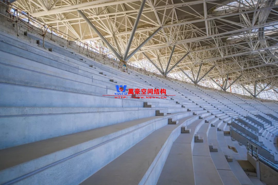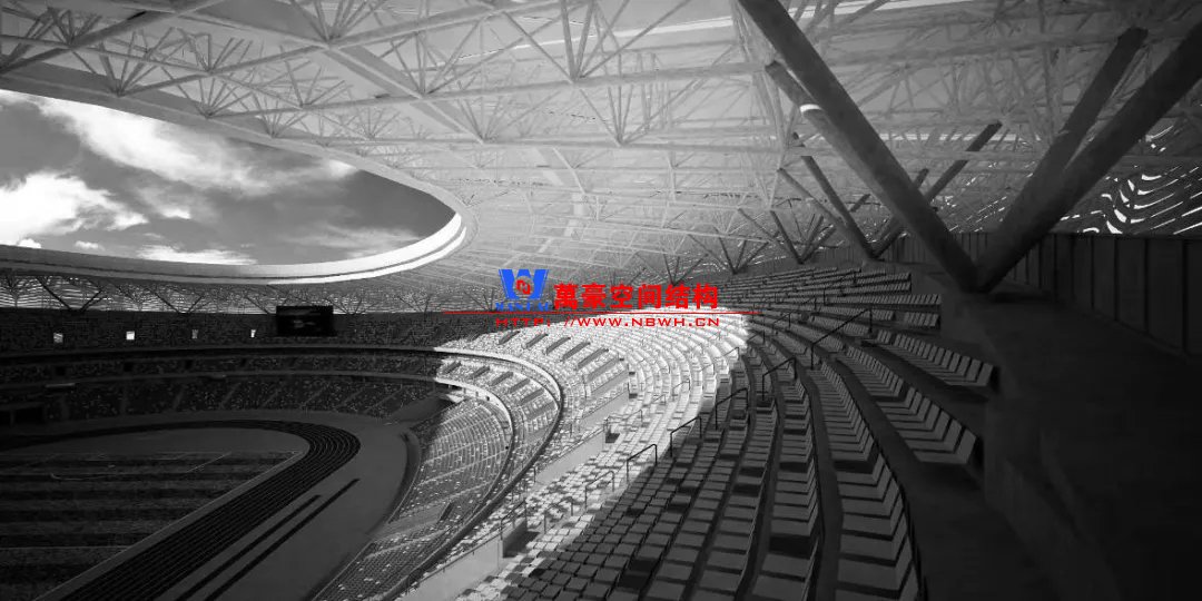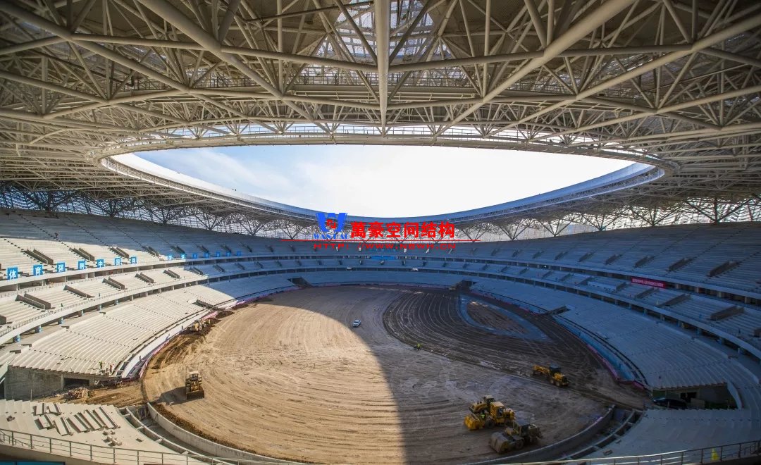 體育場(chǎng)主體建筑為南北長(zhǎng)332m、東西寬316m的橢圓形,鋼結(jié)構(gòu)罩棚最高處高58.3m,最低處高42.6m;中間開(kāi)口南北長(zhǎng)200m、東西寬153m。主體鋼結(jié)構(gòu)采用空間懸挑鋼桁架結(jié)構(gòu),由28個(gè)V形柱支撐72片鋼結(jié)構(gòu)管桁架,整體東西高,南北低,呈馬鞍形,體育場(chǎng)看臺(tái)為框架-剪力墻體系。屋頂圍護(hù)結(jié)構(gòu)為鋁鎂錳直立鎖邊金屬屋面,罩棚立面采用銀白色穿孔鋁板幕墻系統(tǒng),通過(guò)有韻律的變化,表達(dá)了絲綢飄舞的動(dòng)感,輕盈通透的罩棚在夜晚能夠透出賽場(chǎng)內(nèi)熱烈的賽事氣氛,宛如皓月長(zhǎng)空下綻放的盛世之花。碗型看臺(tái)分為上、中、下三層座席,并在中上層看臺(tái)之間設(shè)置包廂層(包括66個(gè)大小包廂)及其座席區(qū),觀眾分別由各層看臺(tái)對(duì)應(yīng)的通道進(jìn)入。