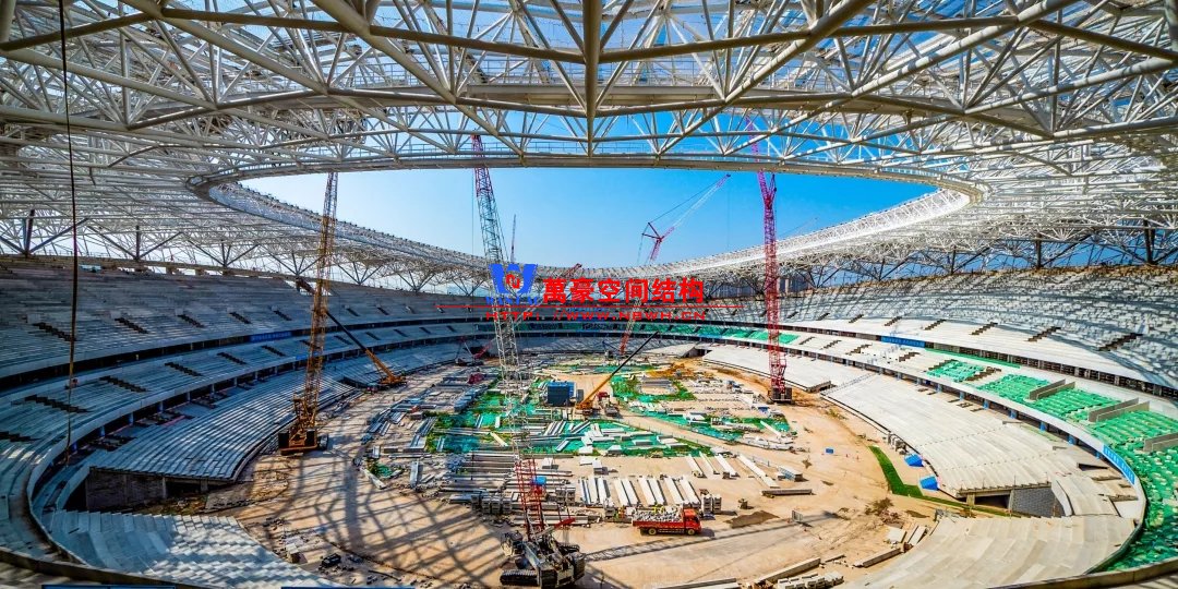 體育場(chǎng)屋面工程由展開(kāi)面積55000㎡的異形雙曲金屬屋面板,和內(nèi)環(huán)8000㎡的陽(yáng)光板拼接而成,施工單位中建二局安裝公司2019年3月11日進(jìn)場(chǎng)后,立即展開(kāi)與鋼結(jié)構(gòu)工程穿插施工。施工高峰期,近600名作業(yè)人員與11臺(tái)大型機(jī)械(其中260噸履帶吊3臺(tái),150噸履帶吊3臺(tái),25噸汽車(chē)吊1臺(tái),5噸叉車(chē)4臺(tái))同場(chǎng)有序作業(yè),實(shí)現(xiàn)屋面區(qū)域全覆蓋施工。