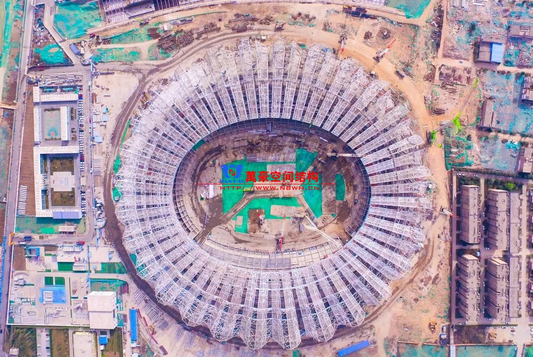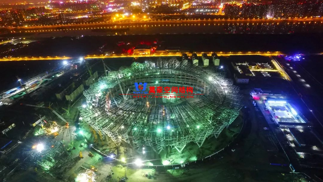體育場(chǎng)罩棚整體造型呈馬鞍形,采用空間管桁架懸挑結(jié)構(gòu)體系,南北長(zhǎng)332m,東西寬316m,罩棚最高58.3m。2019年1月1日首吊,鋼結(jié)構(gòu)分包中建鋼構(gòu)歷時(shí)87天,消耗近5萬(wàn)工日、逾5千機(jī)械臺(tái)班,完成168單元、9500噸罩棚鋼桁架吊裝工作,于3月28日提前合攏。