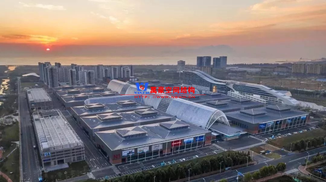 建筑內在的空間結構形成了外部形態的美學韻律和視覺沖擊力,使建筑形象真實而動人。包括展廊與展廳兩部分,以中央十字展廊為功能組織核心,南北各布置6個、共12個獨立展廳單元(尺寸74.4m×136.4m,采用變標高的空間桁架鋼結構)。展廊平面呈十字型布置,東西向長507m,南北向長287m,主拱和次拱方向分別設置兩道溫度縫,最高點標高為35.0m。