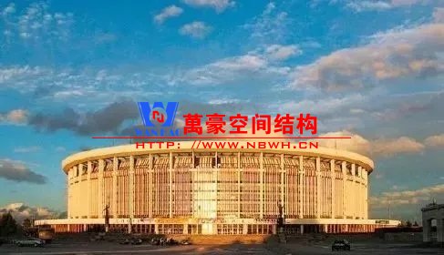 結構體系為輪輻式雙層懸索體系。外環直徑93m,內環直徑12m。輻射狀布置48組索桁架,索桁架高跨比1/17,承重索直徑63mm,穩定索直徑42.5mm。鋼筋混凝土外環截面2.8m*0.62m,屋面為4mm厚有肋薄鋼板。沿環向與豎向腹桿對應處,布置了兩圈豎向鋼板支撐體系,提高了結構整體性能,減低了自身高度。屋蓋用鋼量99.3kg/m2。