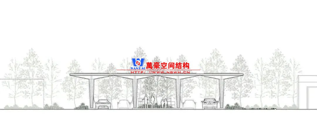 充電站由一系列 “樹” 結構組成。其特征是樹冠狀的頂,過濾陽光并提供遮陽和保護的同時,界定出綠色的環境和平靜的氛圍。這與傳統的加油站形成了強烈的對比,傳統的加油站里車輛排著長隊,到處都是汽油味和汽車尾氣的味道。