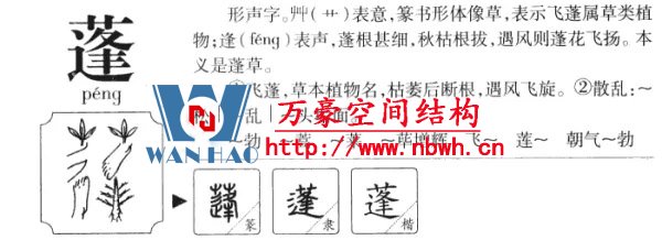 “蓬”,多年生草本植物,花白色,中心黃色,葉似柳葉,子實(shí)有毛。字義有散亂、茂盛、旺盛等意,如蓬松、蓬勃。