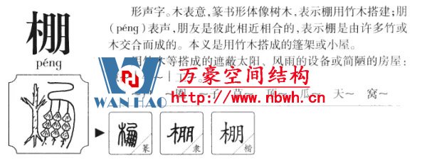 “棚”,用竹木搭成架子,上面覆蓋席、布等做成的遮蔽風(fēng)雨和日光的設(shè)施或簡(jiǎn)易小屋,如窩棚、涼棚、工棚。