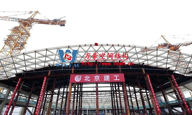 正在滑移施工的鋼屋面網殼用鋼量約2800噸,南北長168米,東西跨度72米,鋼屋蓋網殼面積大,距離地面高度為44米-52米,高空作業量大,構件吊次多達3000次,吊裝時間約2個月,工期緊,鋼結構焊接精度和質量要求極高,屋蓋網殼為索承結構,控制變形難度大。
