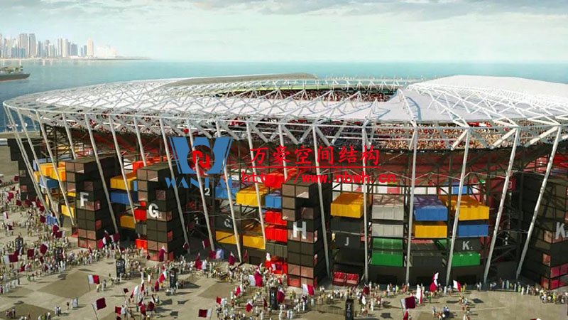 容量40000人。拉斯阿布阿布德體育場將成為有史以來第一個可移動和可重復使用的世界杯體育場。體育場位于45萬平方米的海濱,由從附近港口回收的集裝箱建造而成。在建筑材料方面的這一決定將有助于快速施工,并允許結構在比賽后很容易拆除和運輸。每個集裝箱模塊將運到一個巨型油輪的背面,然后可以插入體育場的外殼。這些集裝箱將會安置座位、廁所、食物攤位和商店,從地面看像樂高組合一樣放在一起。