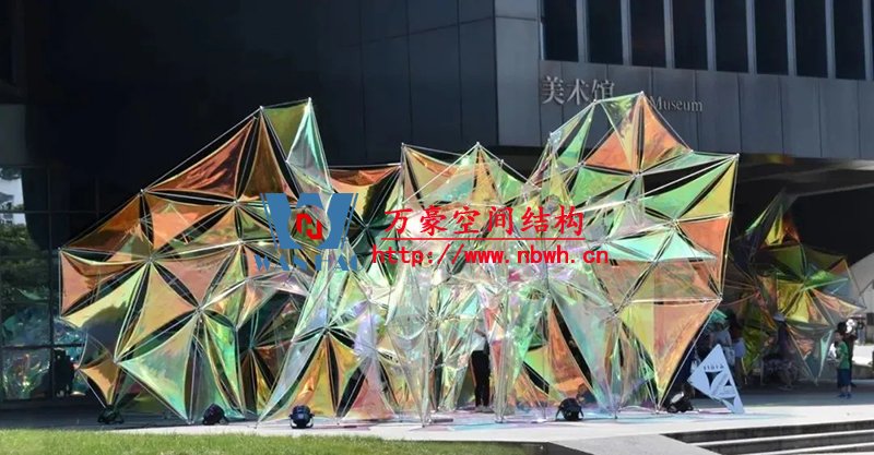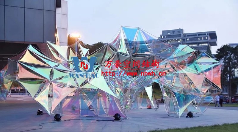 結(jié)構(gòu)體系形成的三角面網(wǎng)格是由計(jì)算機(jī)通過(guò)對(duì)異形曲面細(xì)分并優(yōu)化得到,三角嵌面使用半透明PVC膜。