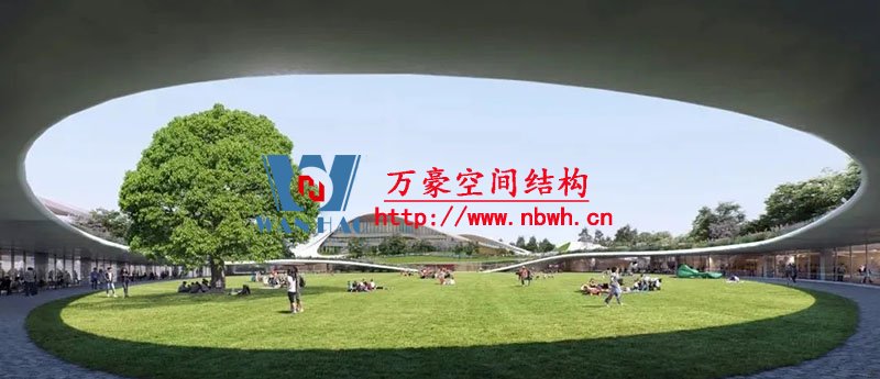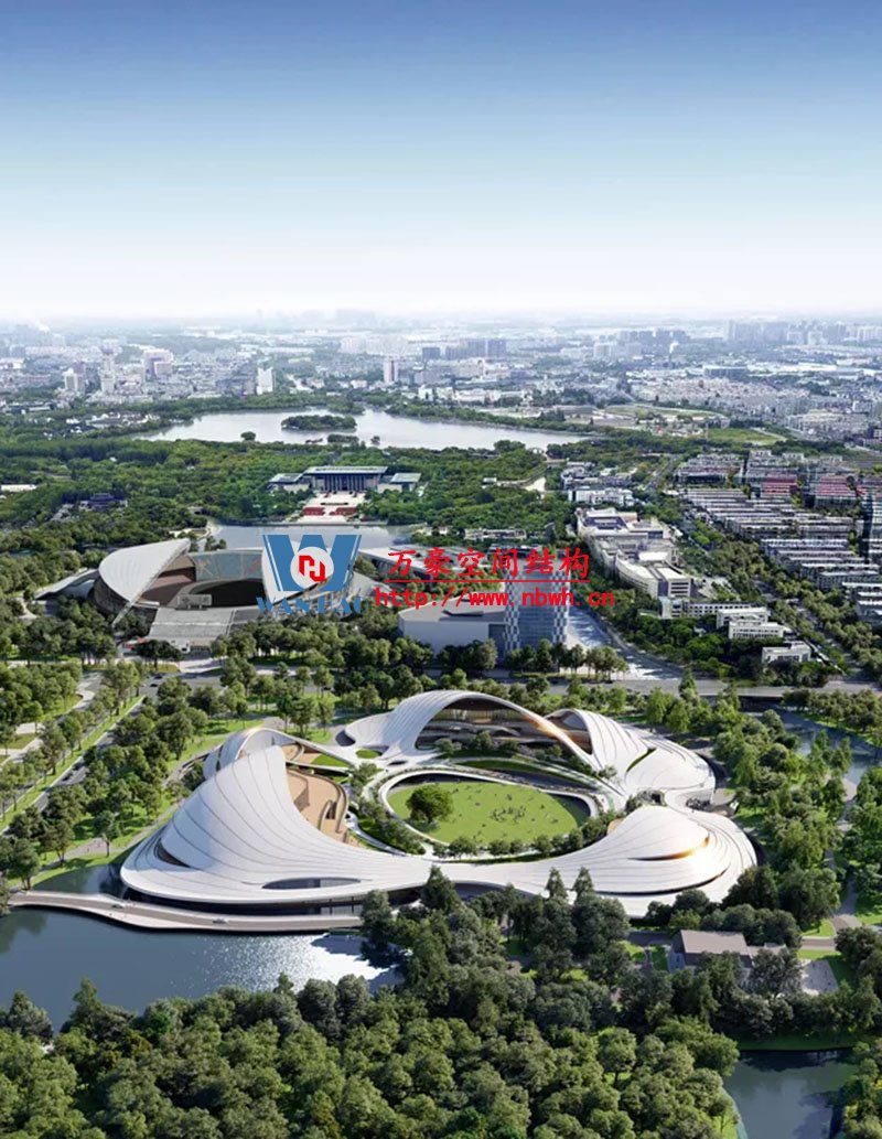 MAD設計了一座公園中的景觀建筑。以中央圓形草坪為中心,人和建筑在此互動、共享,這里成為更開放、更親和、更具活力的新型城市空間。三處場館“手拉手”地連接一起,通過環形屋頂圍合成一個整體。線條有機流動,呼應了江南水鄉的柔美與飄逸,盡顯靈動。