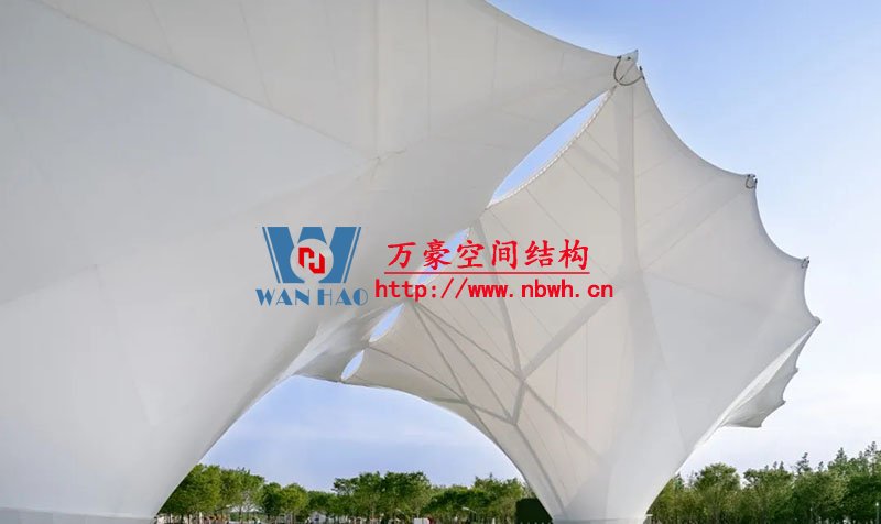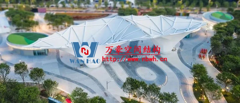 花博園北園的主入口構筑物,是全新“仿生鋼結構骨架外掛柔性幕墻”膜結構,既形似兩棵枝繁葉茂的大樹、又勝似兩朵盎然怒放的白玉蘭。仿生鋼結構體系大門高19.21米,寬100米,寓意中國共產黨建黨一百周年。