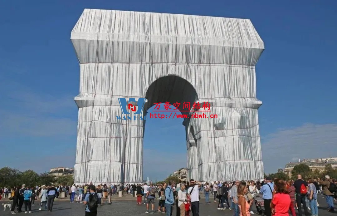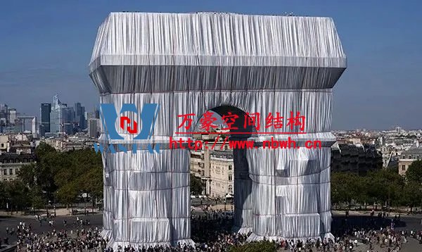 如果你現(xiàn)在去巴黎,你會(huì)發(fā)現(xiàn)凱旋門(mén)變了,它穿上了一件閃閃發(fā)光的銀藍(lán)色“外套”,還系上了“紅腰繩”。施工了三個(gè)月后,巴黎名勝古跡凱旋門(mén)被完全包裹了起來(lái),用掉了27萬(wàn)平方英尺的銀藍(lán)色聚丙烯織物并用紅繩固定。