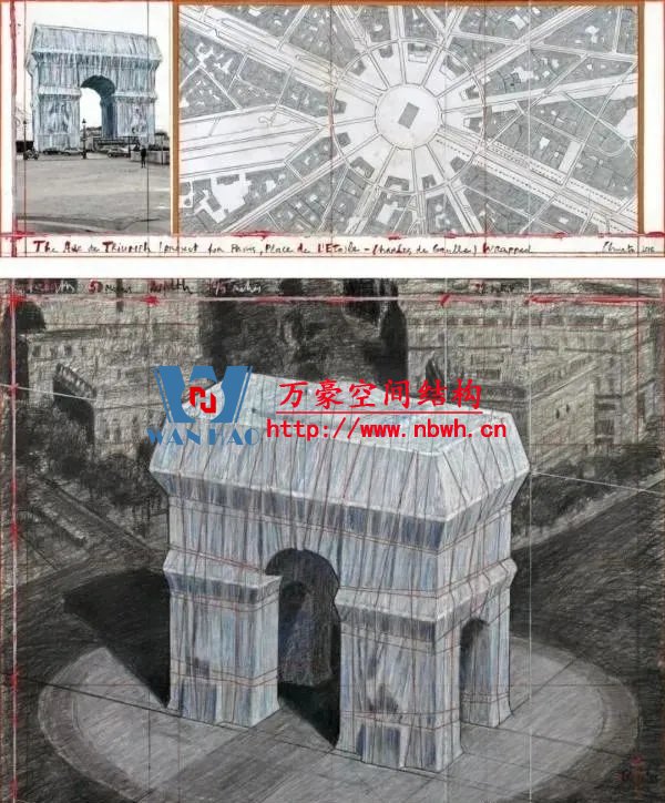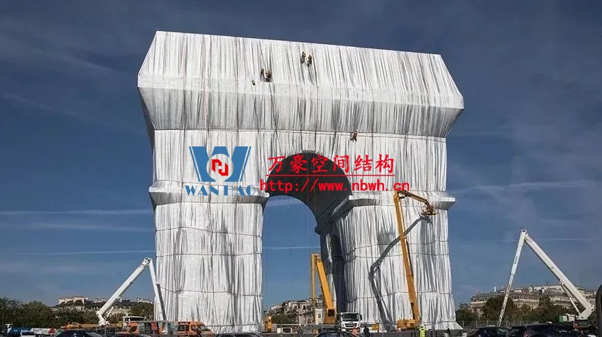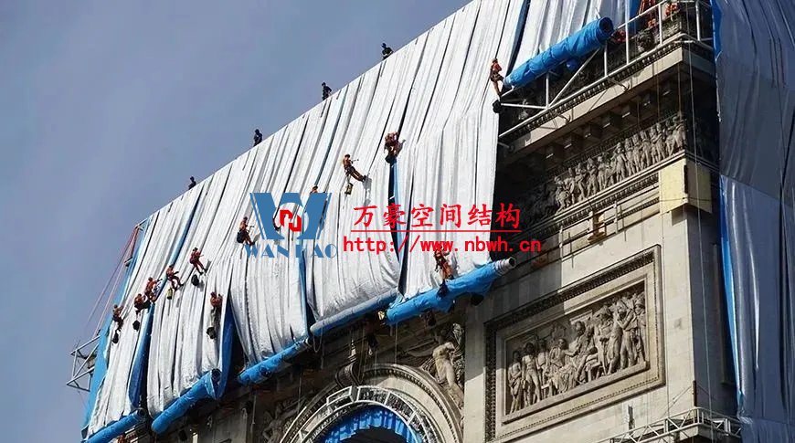 下部結(jié)構(gòu)于今年八月底在凱旋門(mén)上安裝完成,其中包括雕塑、飛檐和裝飾物前的鋼桁架結(jié)構(gòu)、用于固定預(yù)應(yīng)力索的轉(zhuǎn)角構(gòu)件和木質(zhì)箱形結(jié)構(gòu),以及屋頂?shù)膽姨袅褐С薪Y(jié)構(gòu)。由聚丙烯網(wǎng)格布制成的波光粼粼的藍(lán)色織物從屋頂懸掛而下。70多名“蜘蛛人”將成卷的藍(lán)色織物展開(kāi);然后正如克里斯托的拼貼畫(huà)里展示的那樣,再用專用紅繩將織物“系”到巴黎的這座地標(biāo)建筑物上。