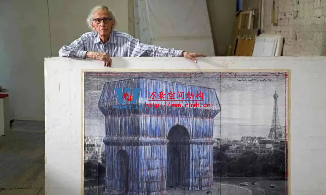 這是已故藝術(shù)家克里斯托和珍妮-克勞德的設(shè)計(jì),他們60年前的瘋狂夢(mèng)想終于變成了現(xiàn)實(shí)。這一項(xiàng)目的運(yùn)營(yíng)總監(jiān)、克里斯托的侄子弗拉基米爾·亞瓦切夫解釋道,閃閃發(fā)光的布料和鮮艷的繩子是克里斯托對(duì)法國(guó)藍(lán)白紅國(guó)旗的“詩(shī)意解讀”。亞瓦切夫和叔叔克里斯托共事長(zhǎng)達(dá)30年。亞瓦切夫在一次視頻采訪中說(shuō)道:“他喜歡能隨著天氣和時(shí)間而變化的顏色。這種布料讓人想起巴黎的屋頂……那種銀灰色。”