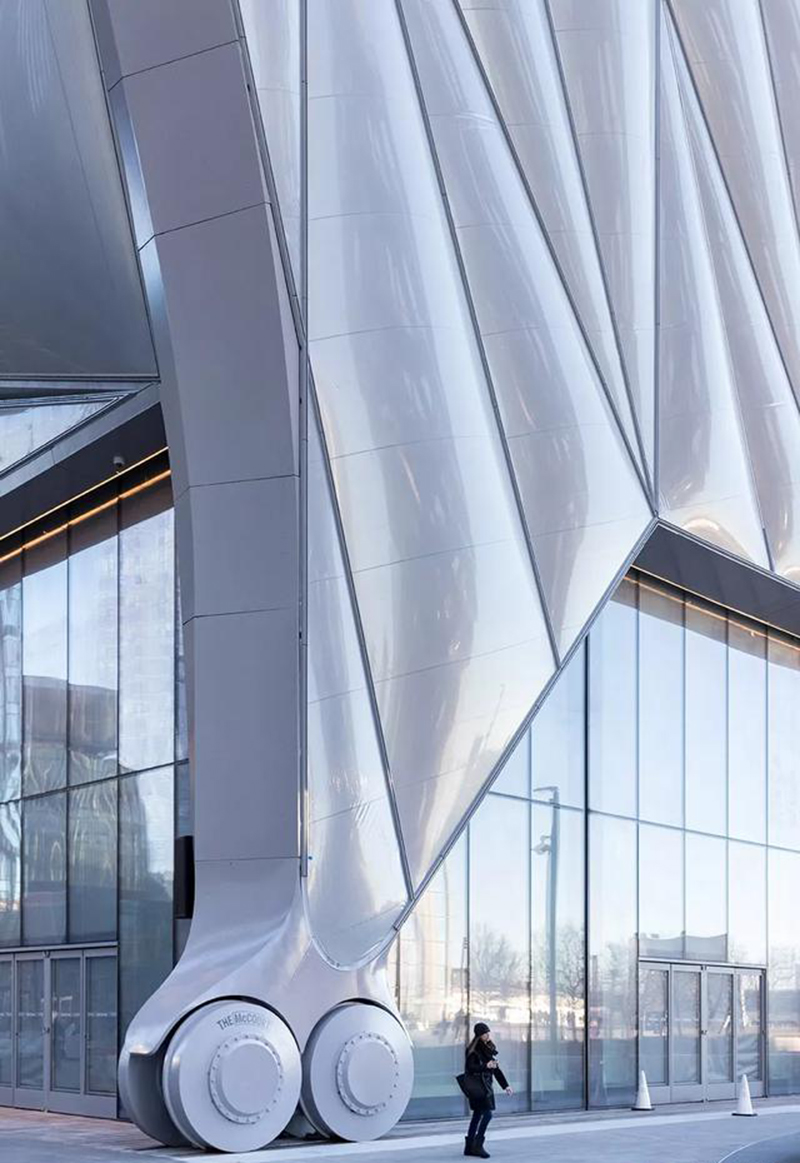紐約The Shed藝術(shù)中心占地約 18580 平方米,共有 8 層,內(nèi)部分別設(shè)有兩層畫(huà)廊空間、一個(gè)多功能劇院、一個(gè)排練場(chǎng)地、一個(gè)創(chuàng)意實(shí)驗(yàn)室和一個(gè)頂層活動(dòng)空間,底層還有餐廳和酒吧。設(shè)計(jì)亮點(diǎn)在于覆蓋在 8 層主體建筑之上的可移動(dòng)銀白色外殼。當(dāng)外殼往外平移時(shí),就蓋住了前方的露天廣場(chǎng),為 The Shed 增加了一個(gè)面積約 1600 平方米的開(kāi)放式大廳“ The McCOURT ”,作為臨時(shí)演出或展覽場(chǎng)地,不用時(shí)再收回去,真正做到將藝術(shù)共享給所有人。
