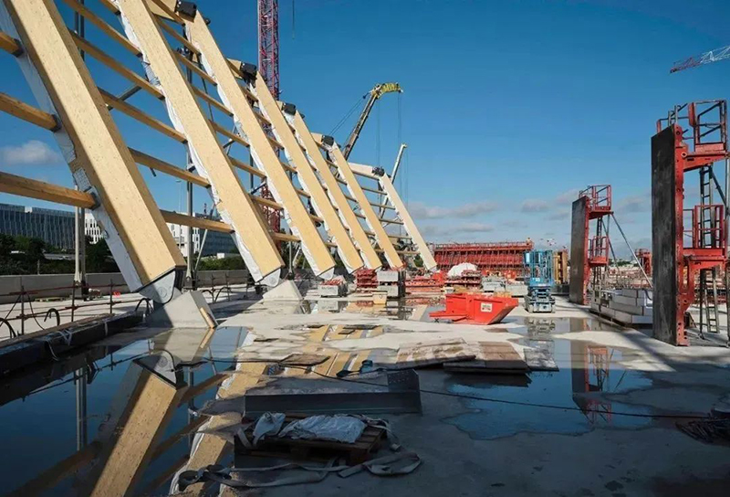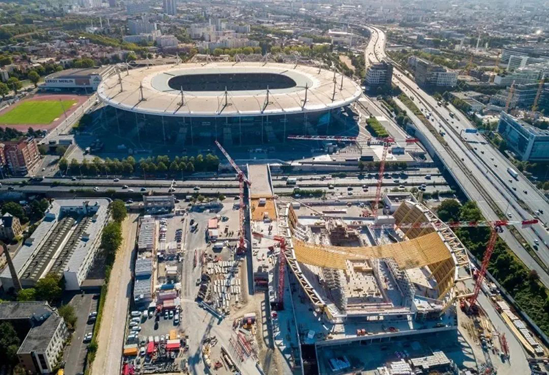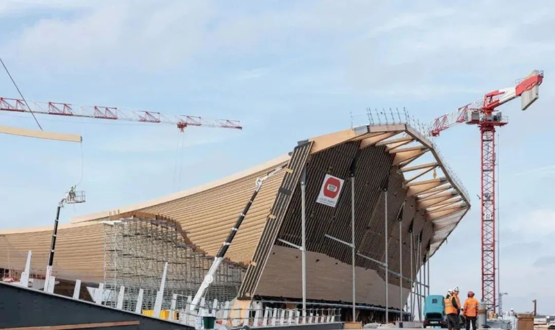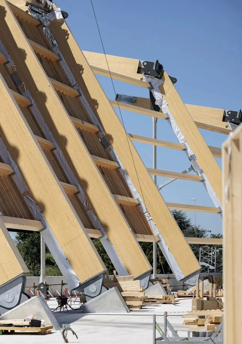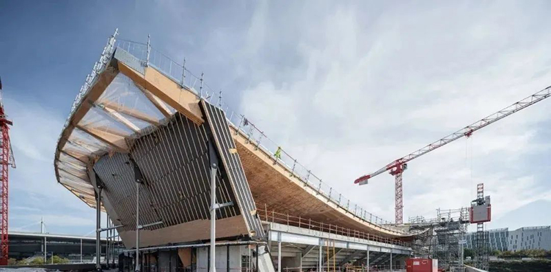 木材是典型的生物基建筑材料之一,是該建筑的主要結構材料。因為木材比其他材料(如混凝土和鋼材)所產生的二氧化碳排放量更少,正好迎合巴黎舉辦歷史上最可持續的運動會的目標。通過在這個巨大的結構中使用木材,該方案將生物材料的使用比例提高了一倍。