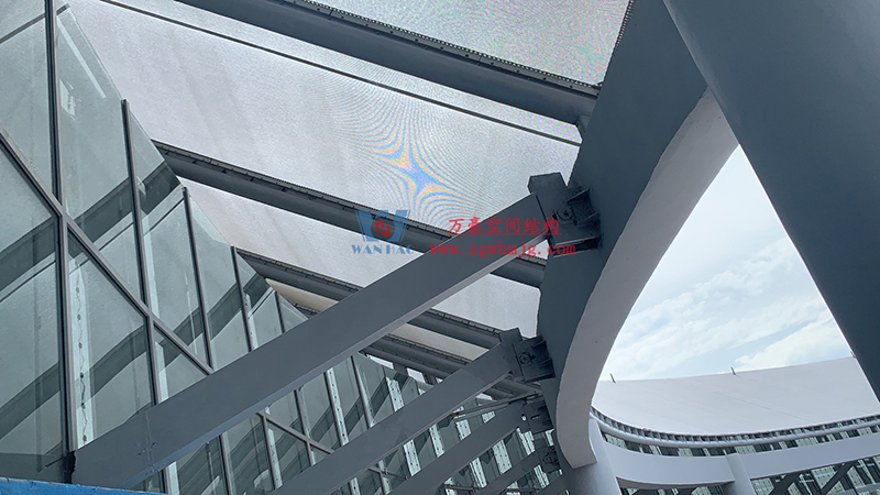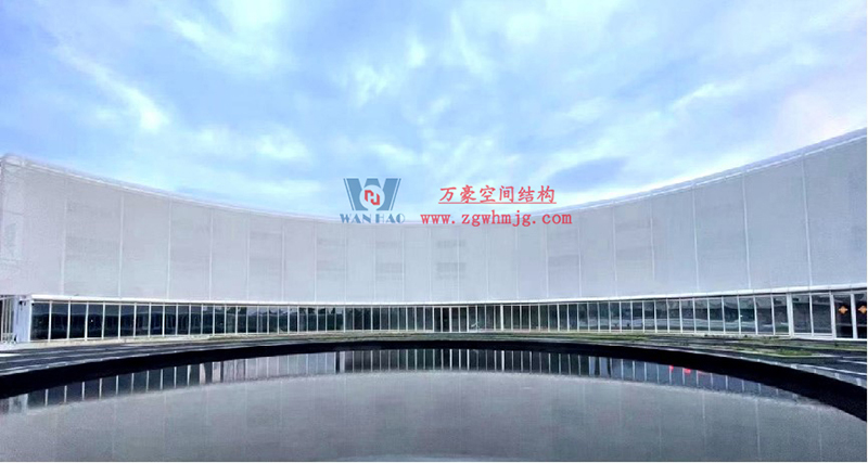 由萬豪承建的紹興國際會展館中心外立面網格織物膜,由5凸5凹不同標高的柔線組合成飄絲帶,視覺效果極具沖擊力。