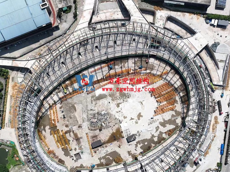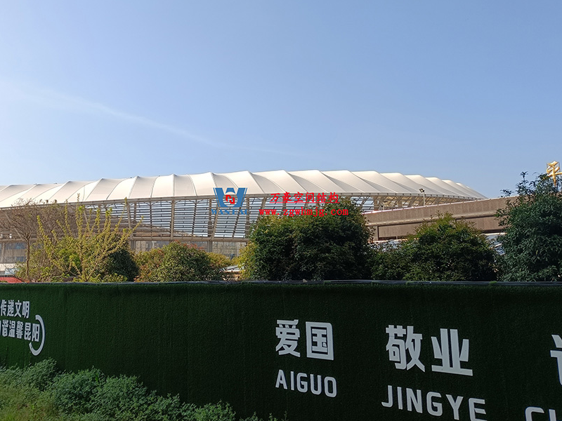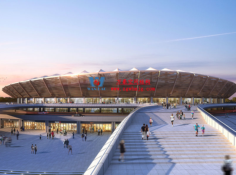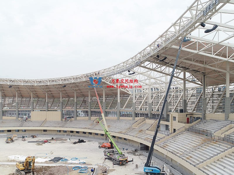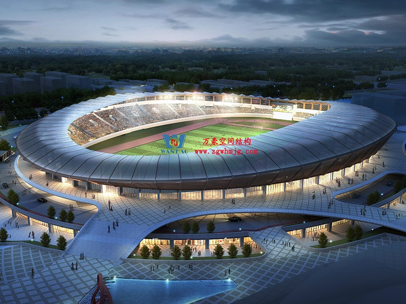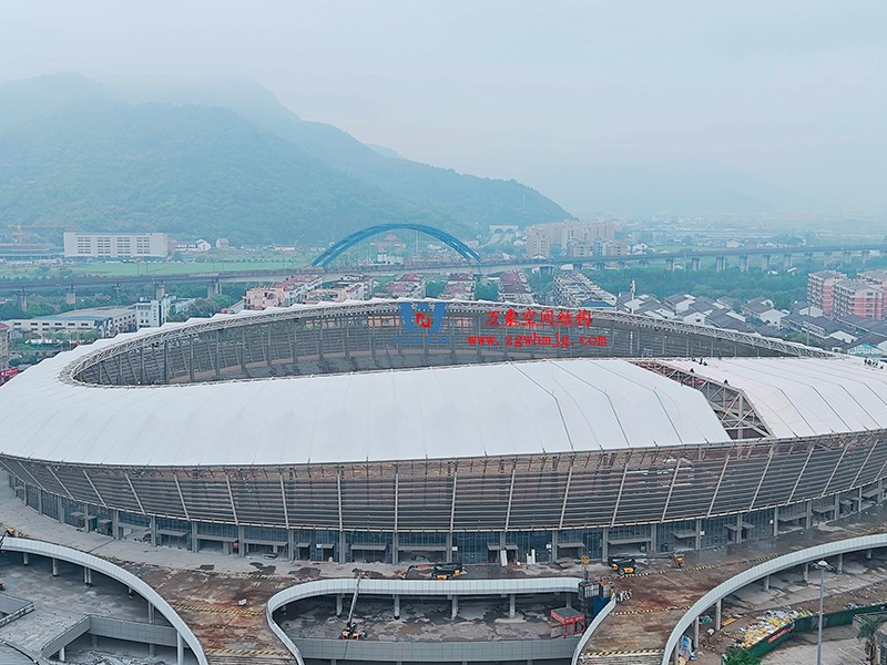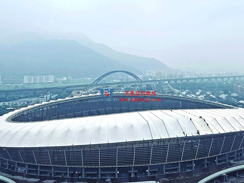 平陽體育中心設計功能為1.5萬座中型乙級體育場及其配套用房,總建筑面積49610平方米,其中鋼結構約3800噸、PTFE膜結構展開面積約25000平方。體育場鋼結構工程鋼柱采用箱型焊接截面,屋蓋采用19種不同跨度懸挑鋼桁架結構,節點均采用相貫焊接節點。屋面覆索膜結構,PTFE膜結構的使用,增加了整個體育場的空間感和動態感,也讓體育館成為了平陽當地的視覺焦點。