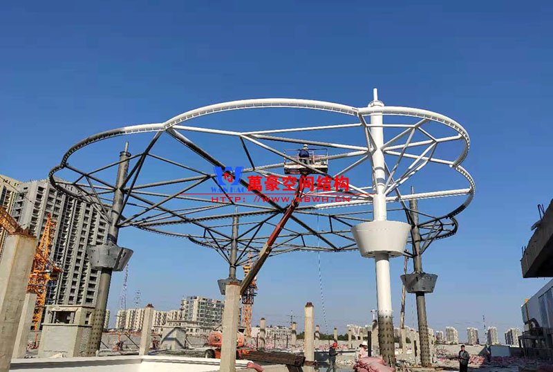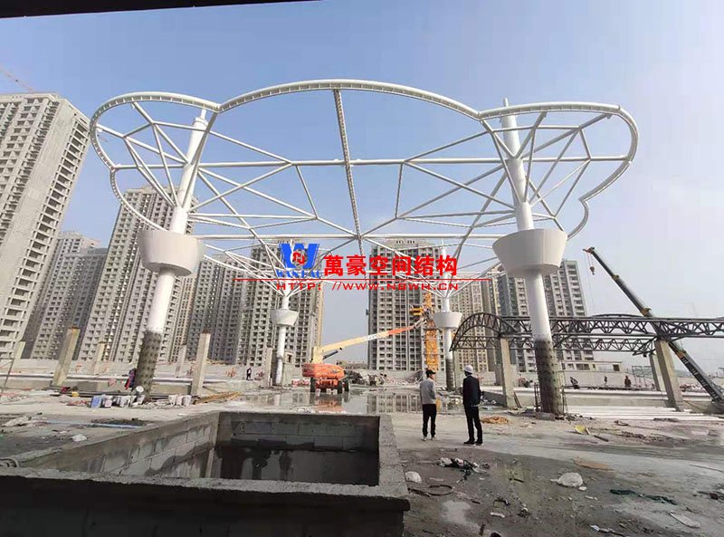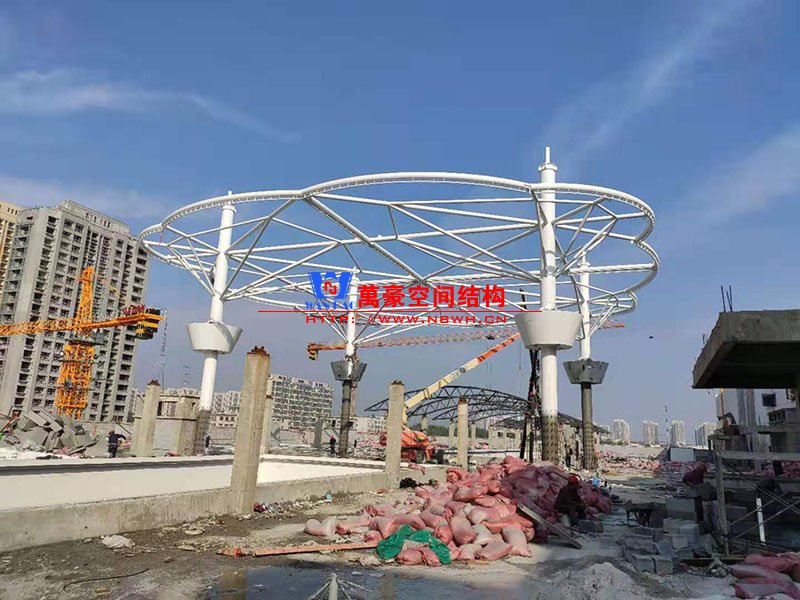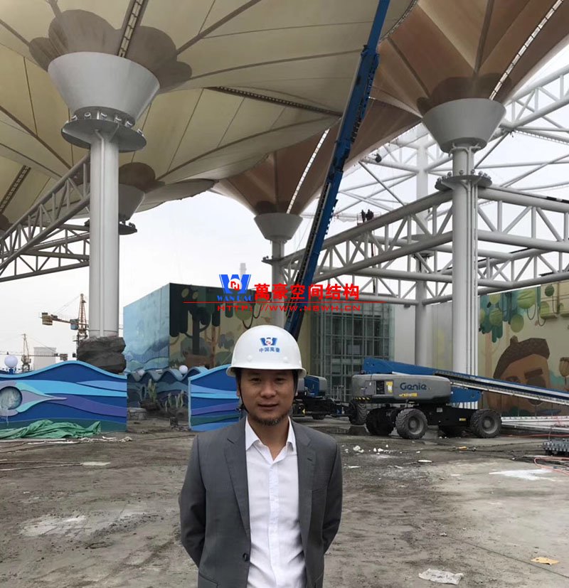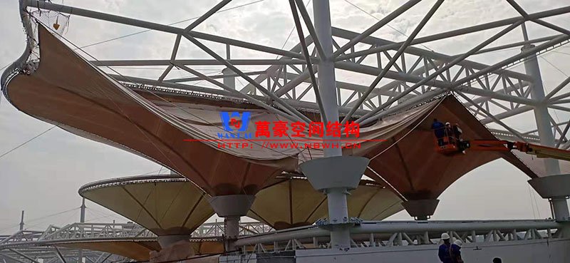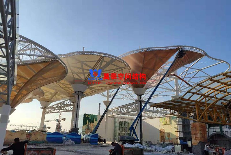該項(xiàng)目設(shè)計(jì)思路沿用了上海世博軸的倒傘形狀,其中最大的一個(gè)傘形面積達(dá)8000平米,工程共計(jì)用鋼1500噸,膜結(jié)構(gòu)展開(kāi)面積3萬(wàn)平米,是鋼、膜、索結(jié)合真正意義上的大型索膜結(jié)構(gòu)。