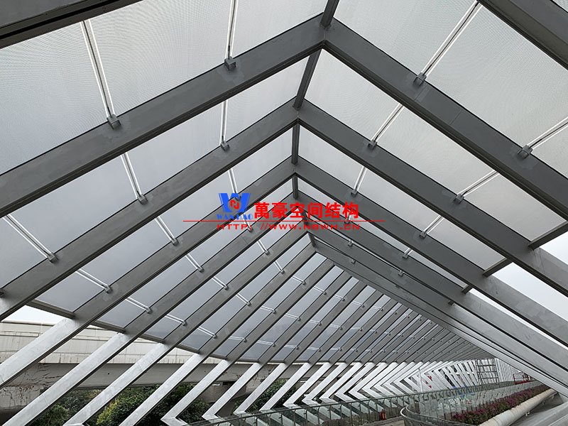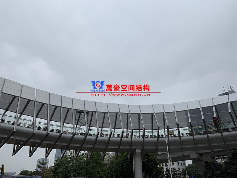 深圳龍崗三館一城項目市政配套工程1號連廊膜結構工程項目為單層ETFE膜結構,共劃分為101個單元,總面積約為2000㎡,由寧波萬豪空間結構工程有限公司承建。膜結構原材采用德國NOWOFOL-300μm鍍點ETFE材料,保證透光率的同時,兼顧防范紫外線。膜結構四周利用鋁合金夾具固定于主鋼結構二次構件上,膜面采用PE鋼索輔助支撐,確保膜面有效承擔相應動荷載。