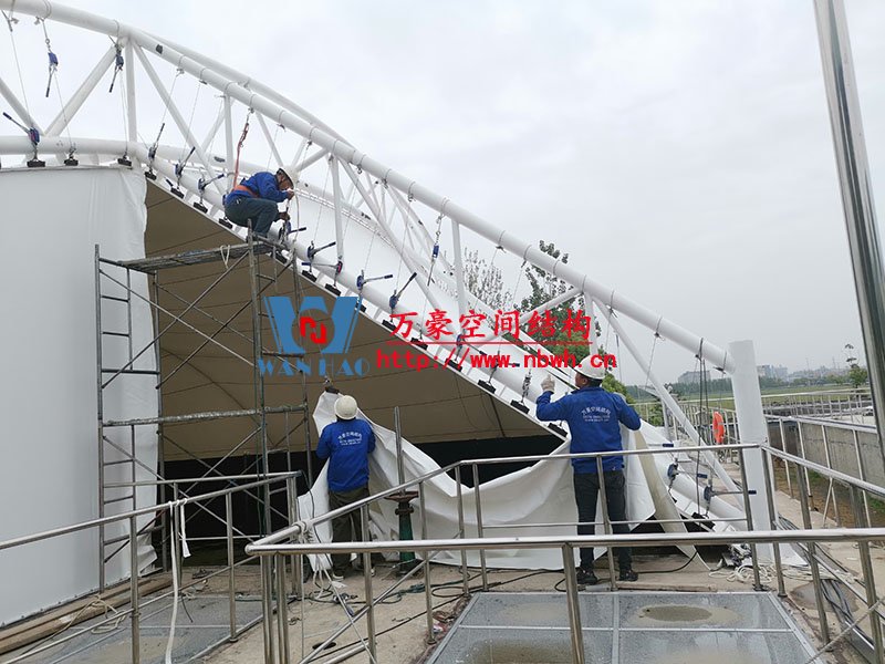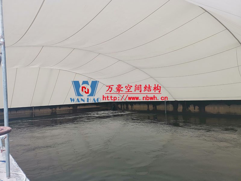 淮安鹽化新材料產(chǎn)業(yè)園區(qū)污水處理廠膜結(jié)構(gòu)項目位于江蘇省淮安市,由寧波萬豪空間結(jié)構(gòu)工程有限公司承建。該項目采用碳鋼骨架(外側(cè))+聚酯纖維(反吊)結(jié)構(gòu)形式,造型美觀,經(jīng)濟適用。