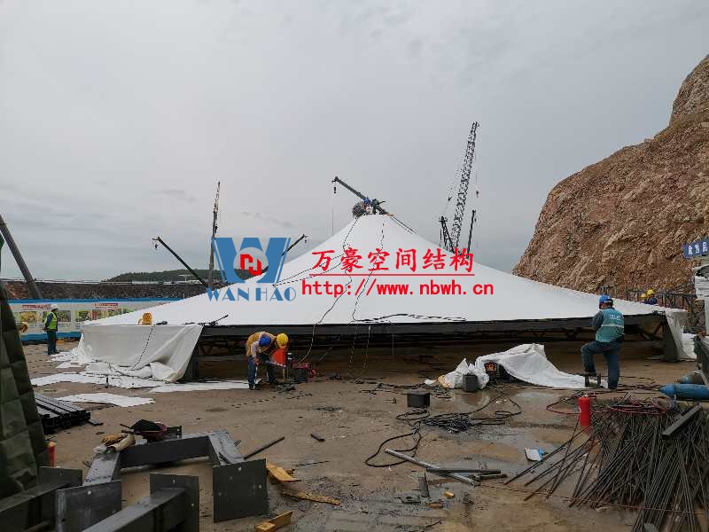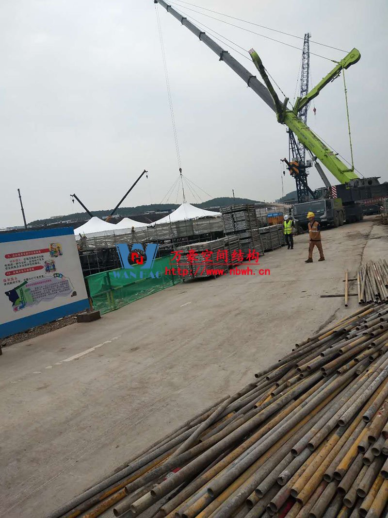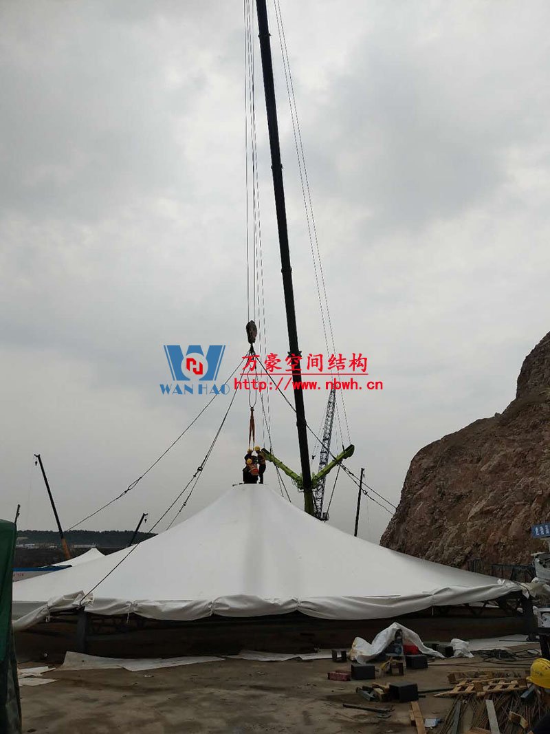 南京園博園穹蓋式膜結構棚項目位于南京市江寧區湯山風景區,該工程由寧波萬豪空間結構工程有限公司承建。 目前,第一個保溫棚已經吊裝到位,接下來第二、第三個棚按順序拼裝和安裝。