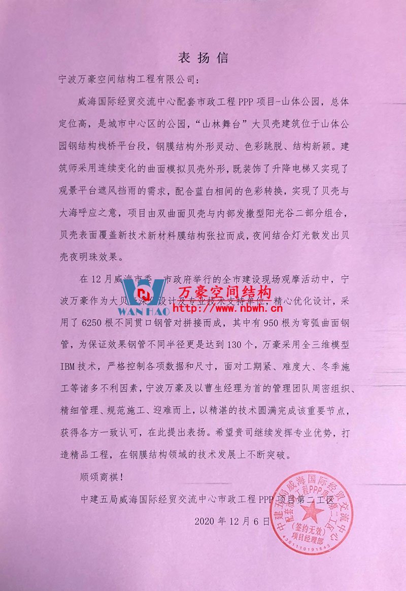 面對(duì)工期緊,難度大,冬季施工等不利因素,寧波萬(wàn)豪空間結(jié)構(gòu)管理團(tuán)隊(duì)周密組織、精細(xì)管理、規(guī)范施工、迎難而上,以精湛的技術(shù)圓滿完成該施工部署。在12月威海市委、市政府舉行的全市建設(shè)現(xiàn)場(chǎng)觀摩活動(dòng)中,獲得各方一致認(rèn)可。