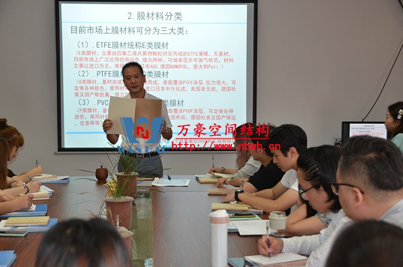 最后,由萬豪總經理張總給大家分享萬豪空間結構企業文化及全面的膜結構工程技術知識。內容包括膜結構行業發展現狀、膜材料分類、膜結構優勢及應用領域、膜結構產品結構形式等。