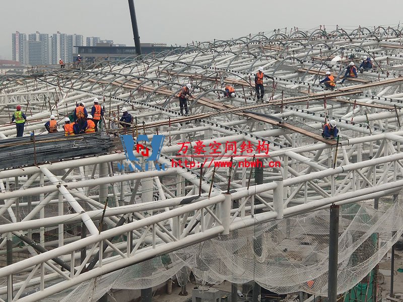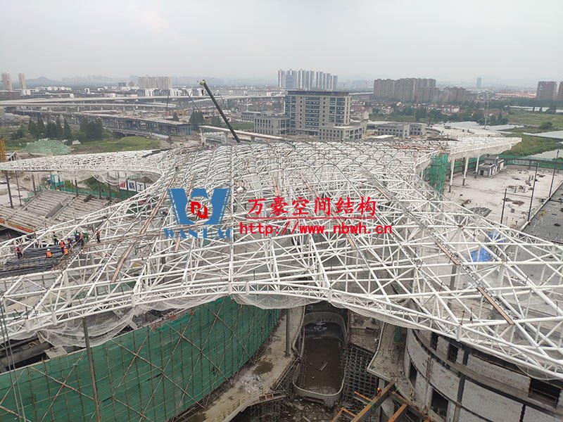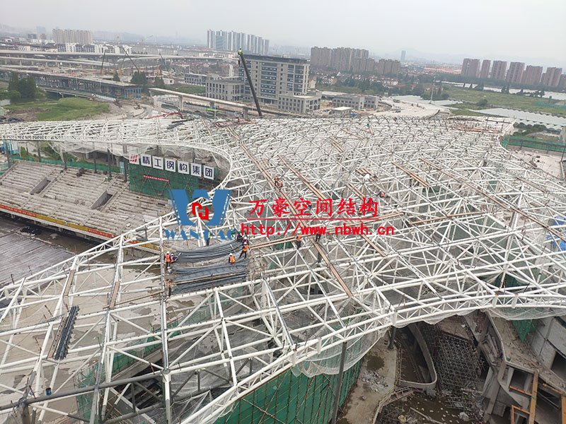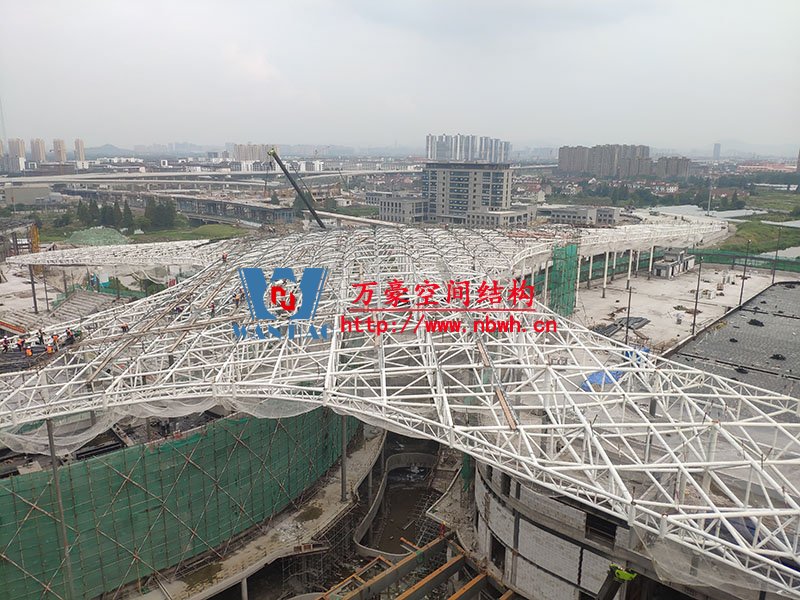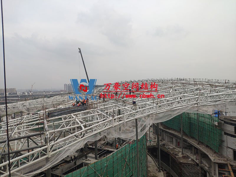 項目一共分六區(qū),目前,一區(qū)鋼構件安裝完成,二區(qū)拉膜板安裝完成,拱桿完成50%。整體拱桿安裝完成45.6%,拉膜板安裝完成53.6%。