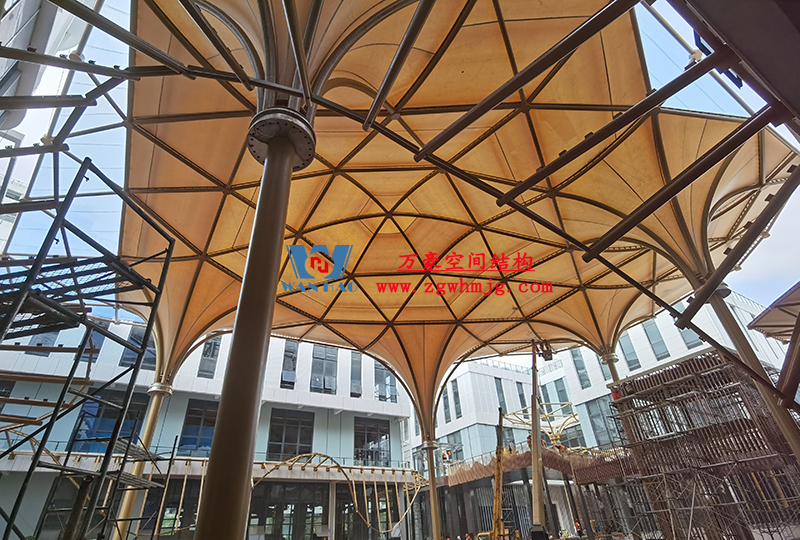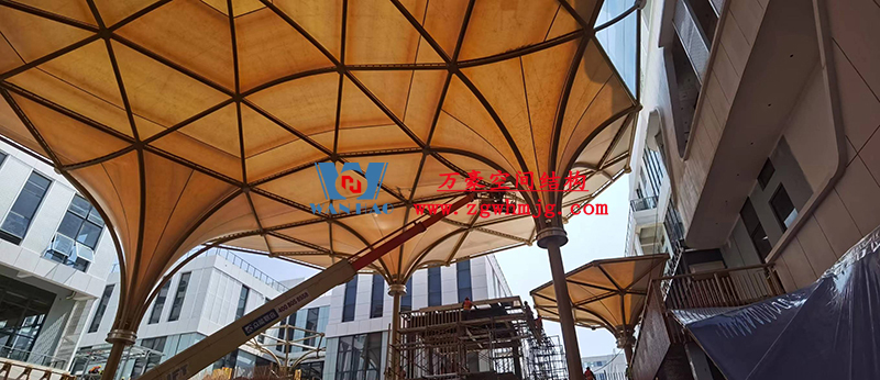 本項目中國—東盟特色商品匯聚中心以(東盟博覽會)為主要議題建設的跨國經濟交流平臺,業主為新加坡著名開發商,對項目品質和工藝有極高的要求和主見,本項目采用了非常規做法,把倒傘狀結構設計于膜屋面下方,仰視穿過空間結構看膜,整體視覺豐富,空間質感效果明顯。此設計施工在倒傘類膜結構中尚屬首例,在景觀天幕項目中可以推廣應用。