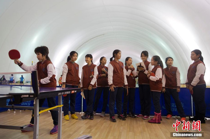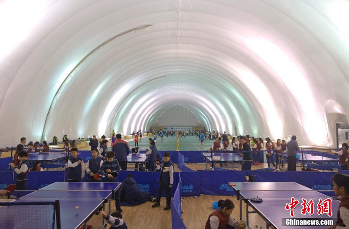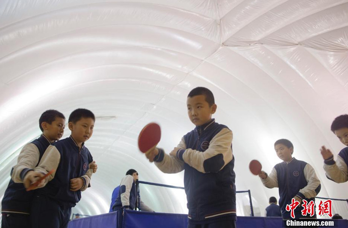 12月1日,一群學生在北京市某學校充氣膜結構體育館學習乒乓球。該體育館的PM2.5過濾系統能夠過濾輸入室內的空氣,過濾后的空氣通過風道輸送至充氣膜內。充氣膜內氣壓大于室外氣壓,可以將PM2.5隔絕在充氣膜館之外。中新社記者 劉關關 攝 (來自:中國新聞網)