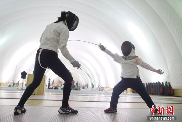 12月1日,一位學生在北京市某學校充氣膜體育館學習擊劍。11月29日空氣重污染橙色預警;11月30日霾橙色預警;12月1日大霧橙色預警。北京史上首次三個預警全“橙”發送。截至昨日,今年最嚴重空氣污染過程已持續了5天。昨夜,冷空氣抵達北京,霧霾逐漸消散。今起至4日,京城空氣優良。昨日24時,市空氣重污染應急指揮部解除北京空氣重污染橙色預警。 (來自:中國新聞網)