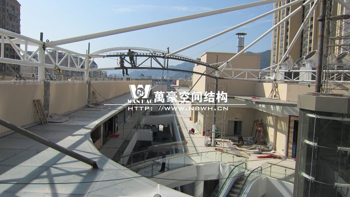 本工程總建筑面積約900平方米,主體一根主柱、九根支柱,四周單片桁架連接,總體一個(gè)帽柱,直線長為26.9米,帽柱總高33.6米,寬為27.8米。因?yàn)楸竟こ套湓谏虡I(yè)區(qū)中心,四周都是五層商鋪,吊車無法進(jìn)入施工現(xiàn)場,先用25噸吊車把材料送到五層樓房頂,后用人工或手拉葫蘆進(jìn)行運(yùn)送和安裝。施工范圍包括鋼結(jié)構(gòu)系統(tǒng)與膜材系統(tǒng)的制作和現(xiàn)場安裝施工,現(xiàn)工程已經(jīng)進(jìn)行到鋼結(jié)構(gòu)階段。