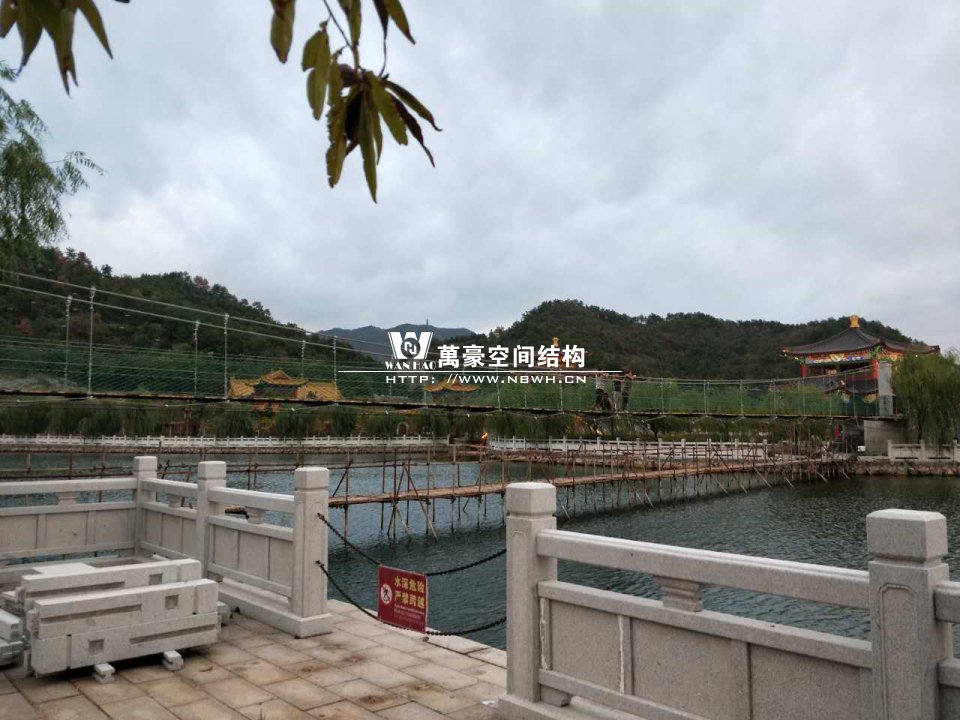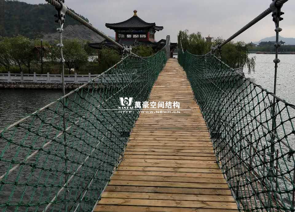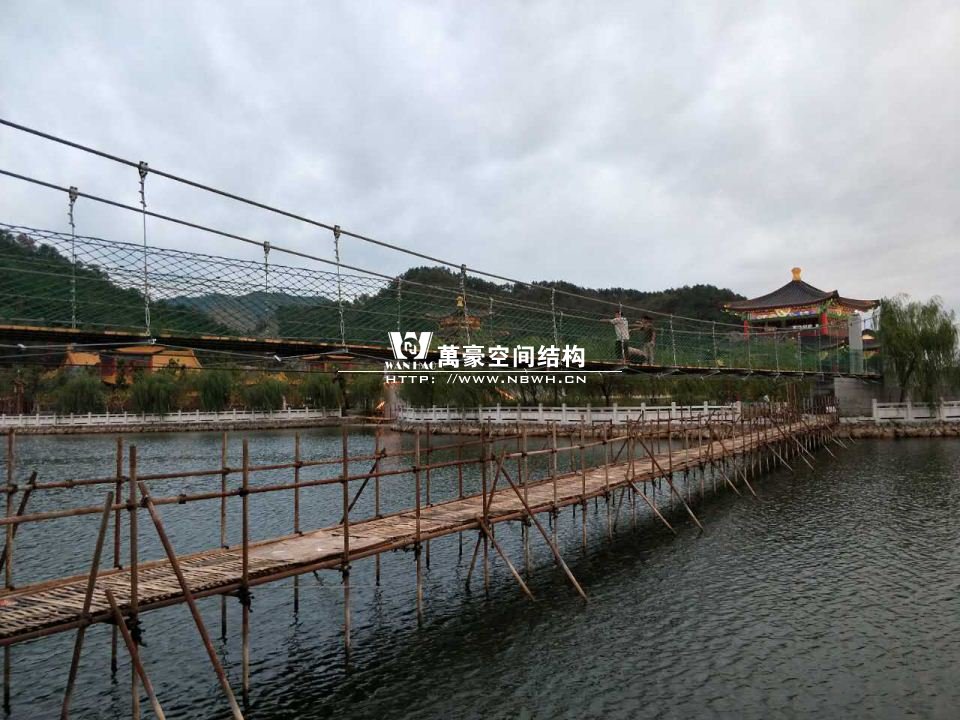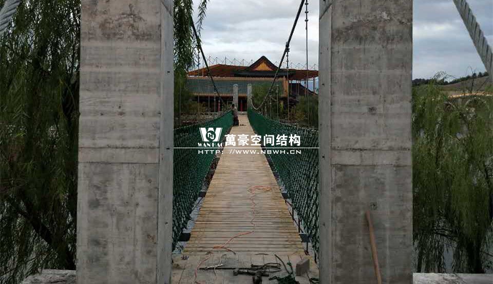 該橋采用8根柔性鋼絲繩,4支立柱作為受力構件,橋面采用組合型鋼作為支撐面,上鋪防腐木枋板。根據橋面與水位的相對高程,吊橋主跨為65m。該橋橋面凈寬度為1.5m,吊橋橋面總寬度2.0m。上鋪4公分厚的防腐木枋板。最多可承受130人行走,橋下能自由通行龍船。符合景區游客娛樂性游玩與功能性通行的完美結合在一起。