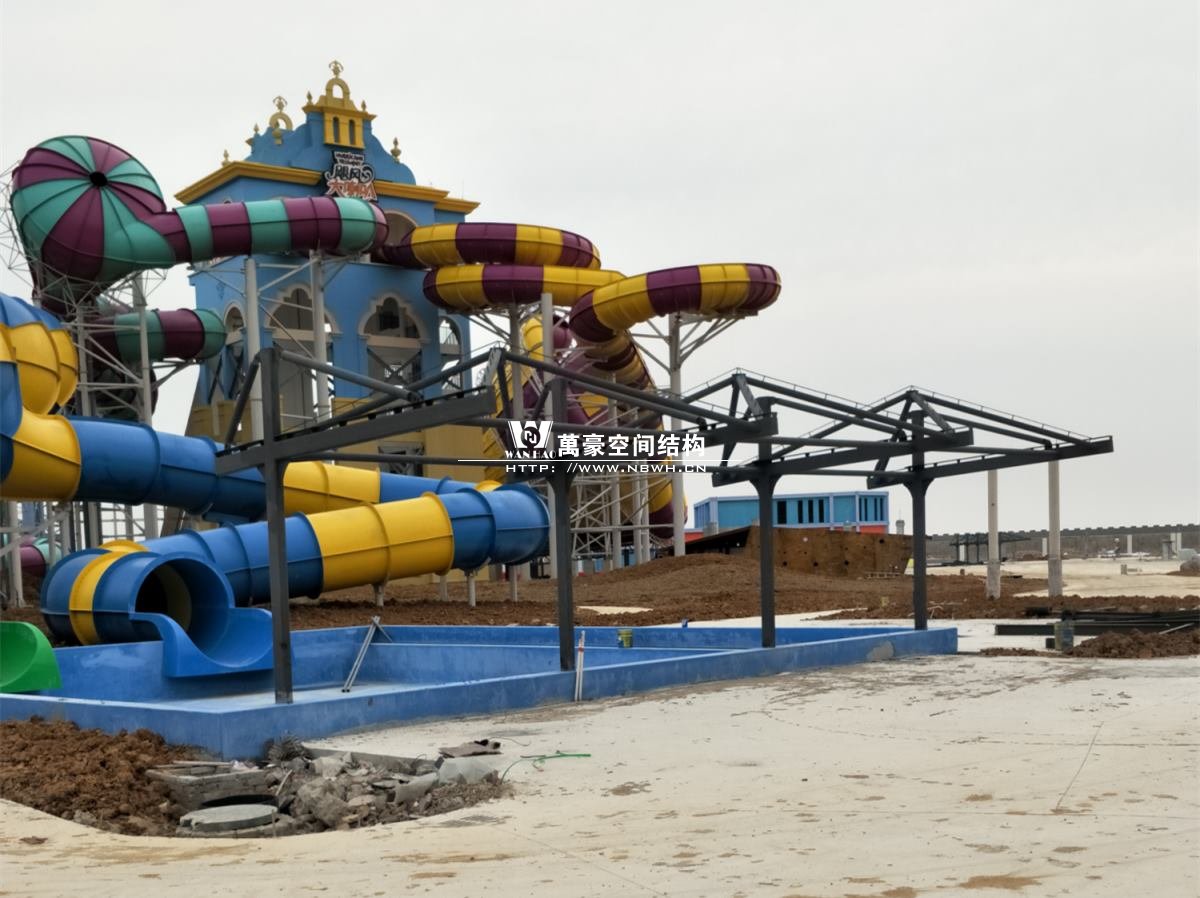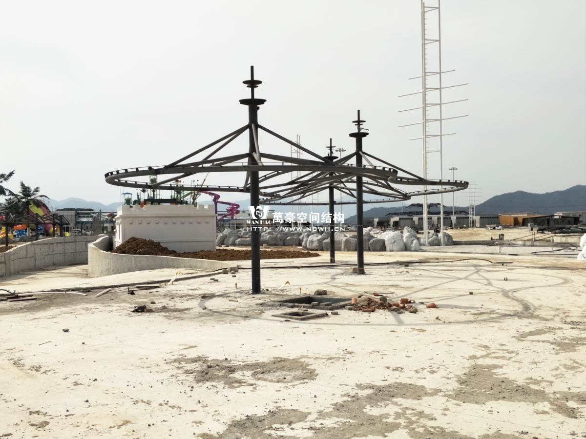 海闊天涳水世界鋼膜結構工程,由寧波萬豪空間結構工程有限公司承建。現場測量、深化設計、制作及安裝由寧波萬豪空間結構工程有限公司全權負責;用鋼量高達180噸,建筑面積達5000平米。